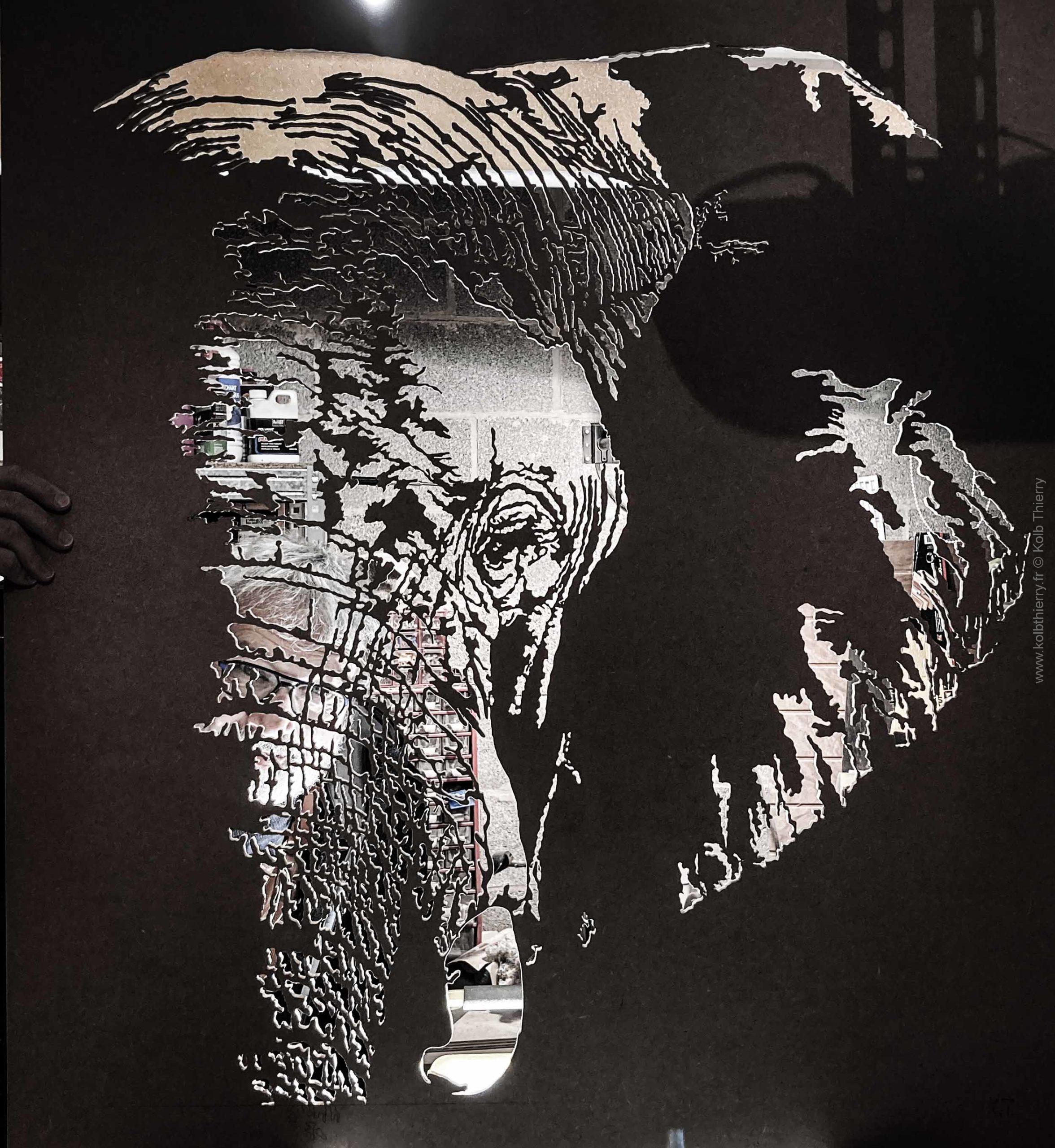 Vendredi 16 avril, Thierry vient de terminer la découpe très technique de Gondwana, cet impressionnant Eléphant patriarche, en format Portrait.