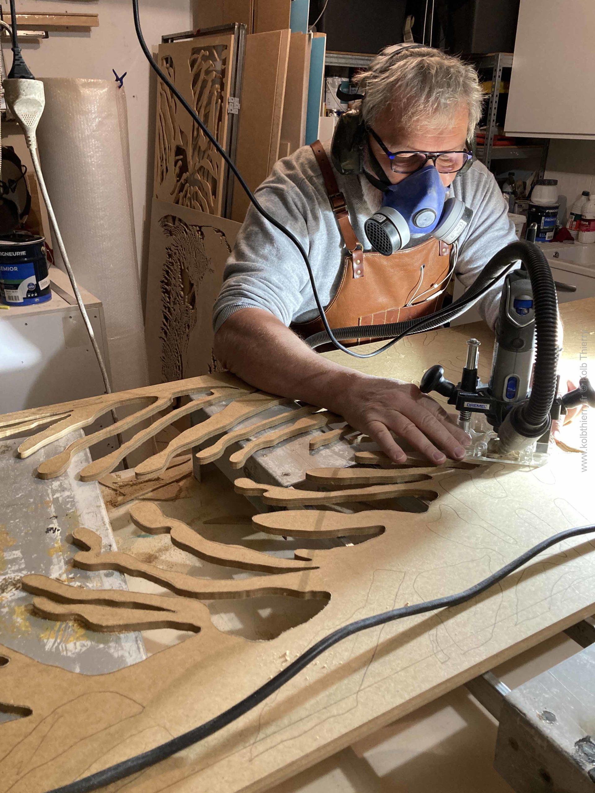 Lundi 19 avril, Thierry démarre la découpe des 6 volets du paravent Auprès de Monstera.