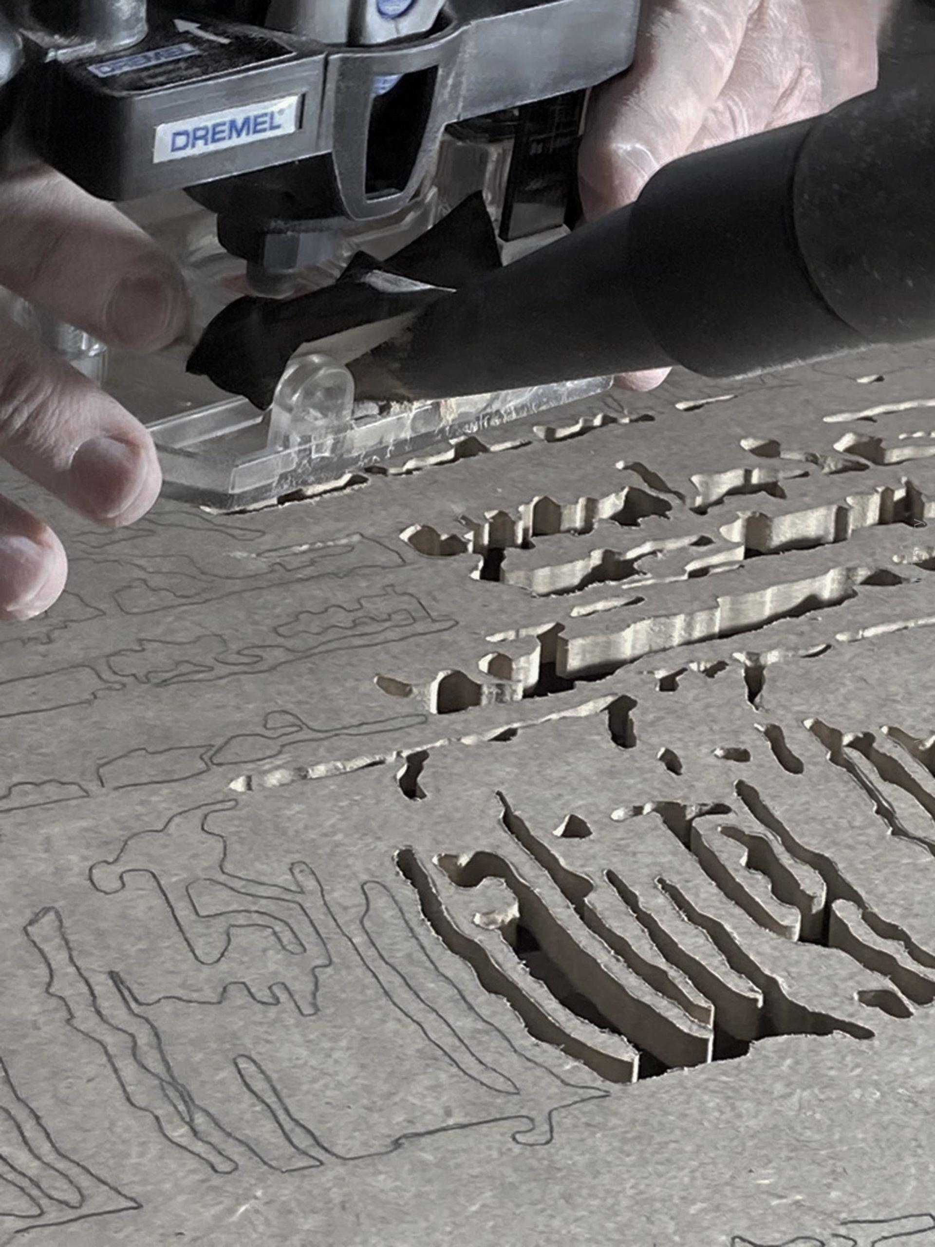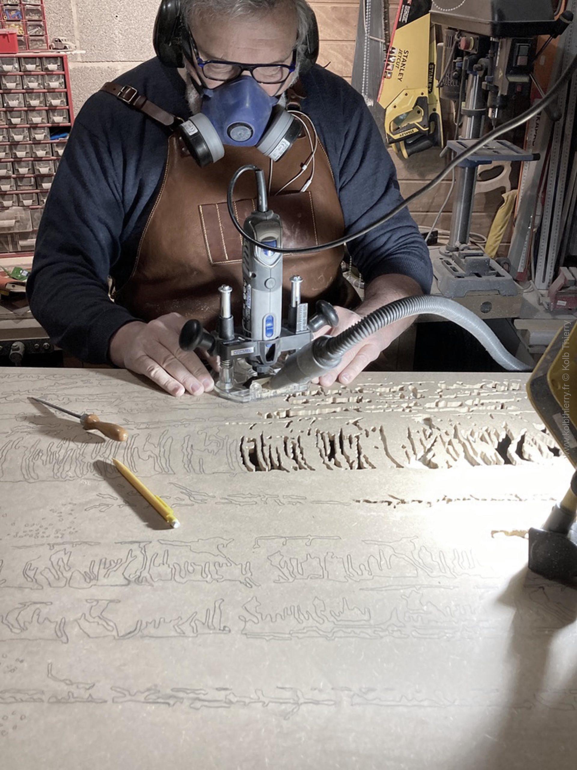 Restent à suivre, les étapes de ponçage, de mise en teinte, d’assemblage et d’élcairage, car cette sculpture est prévue pour être rétroéclairée par des leds intégrées.