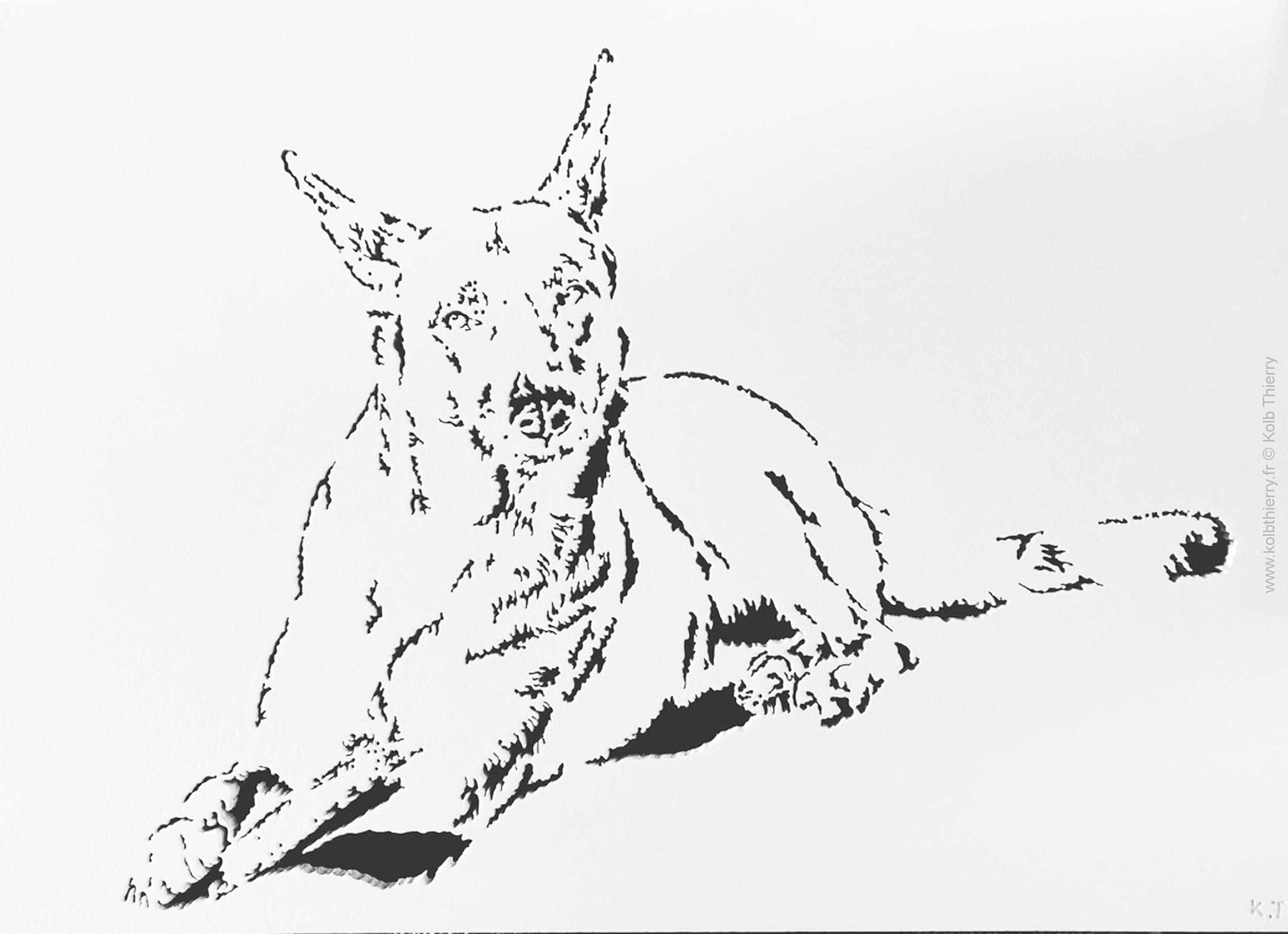 Lundi 21 juin, Booba, délicate sculpture sur bois découpé d’une chienne berger.