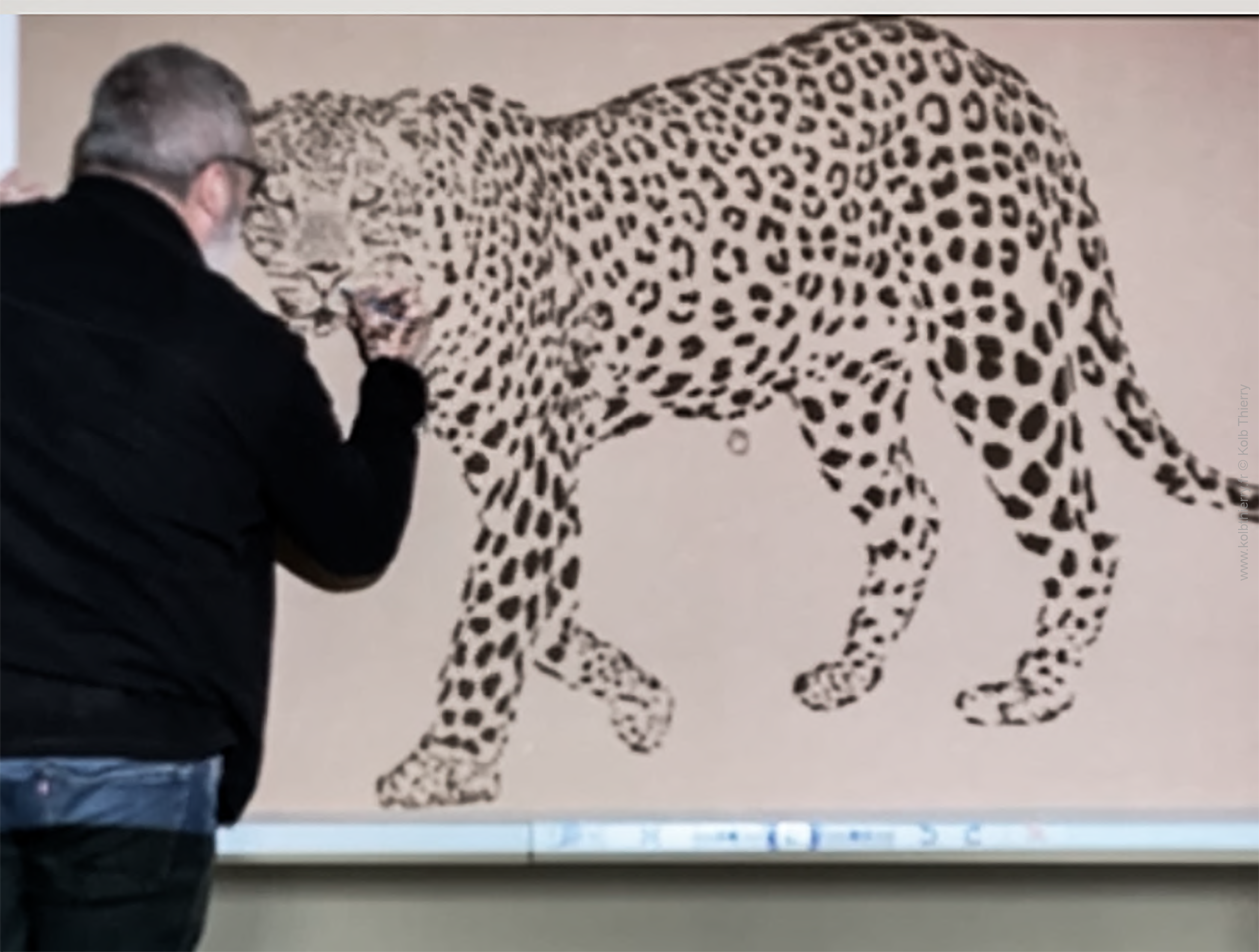 Mercredi 16 mars, Thierry travaille sur la réalisation d’un léopard en marche dans la savane. l’occasion pour l’artiste de dialoguer les yeux dans les yeux avec Rencontre dans la savane.