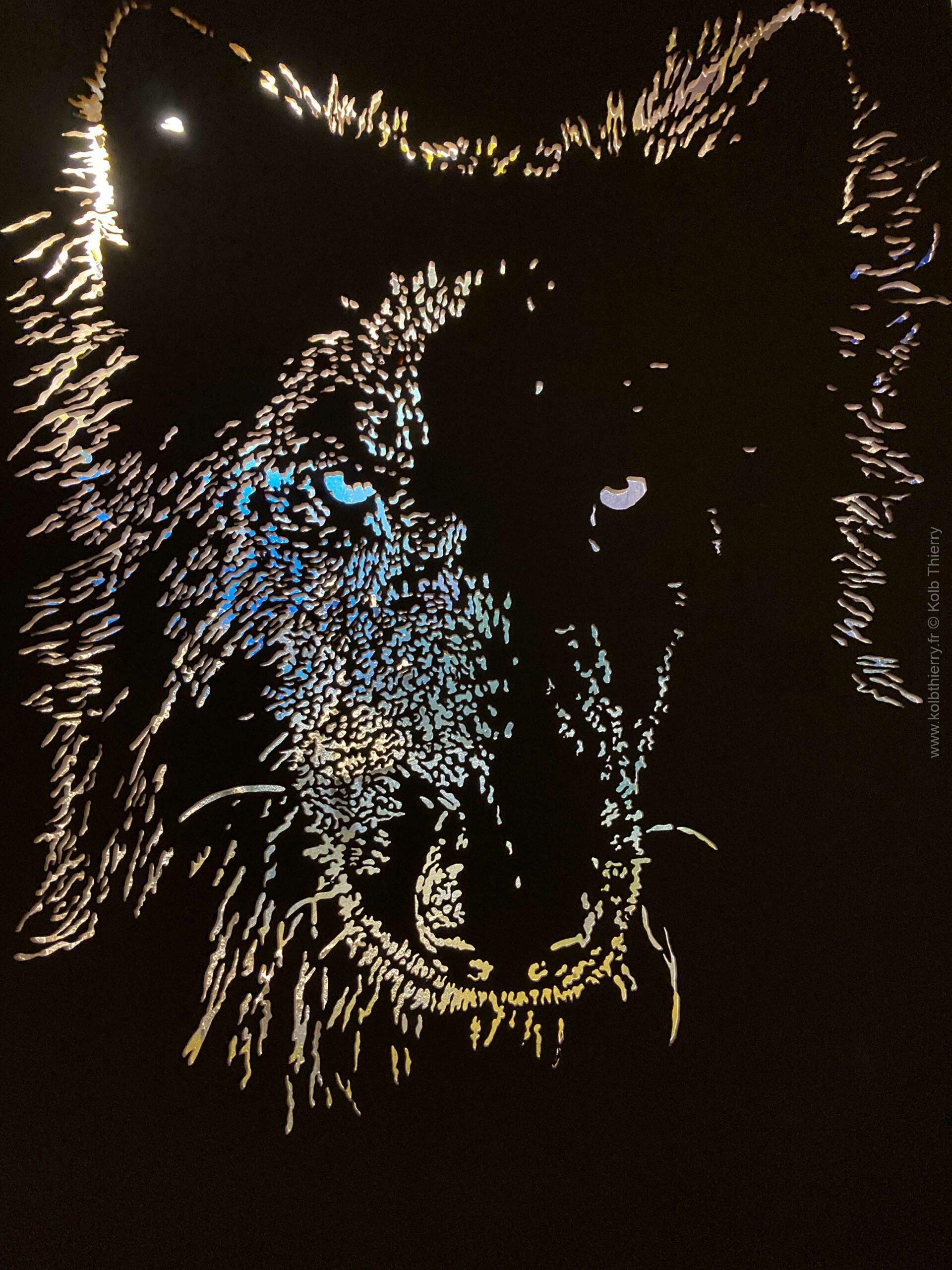 Sculpture murale sur bois découpé à la main. l90xH122, rétroéclairé.