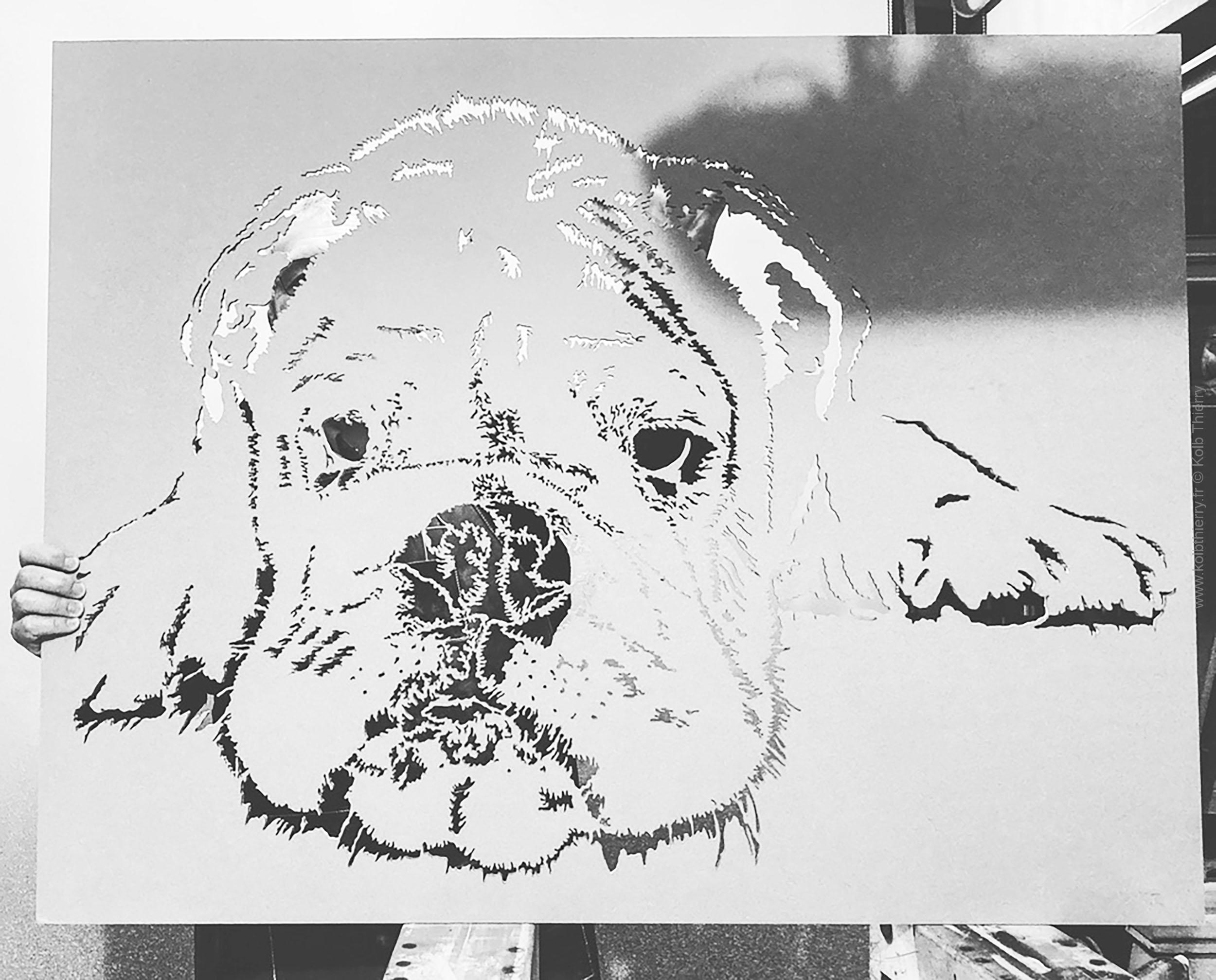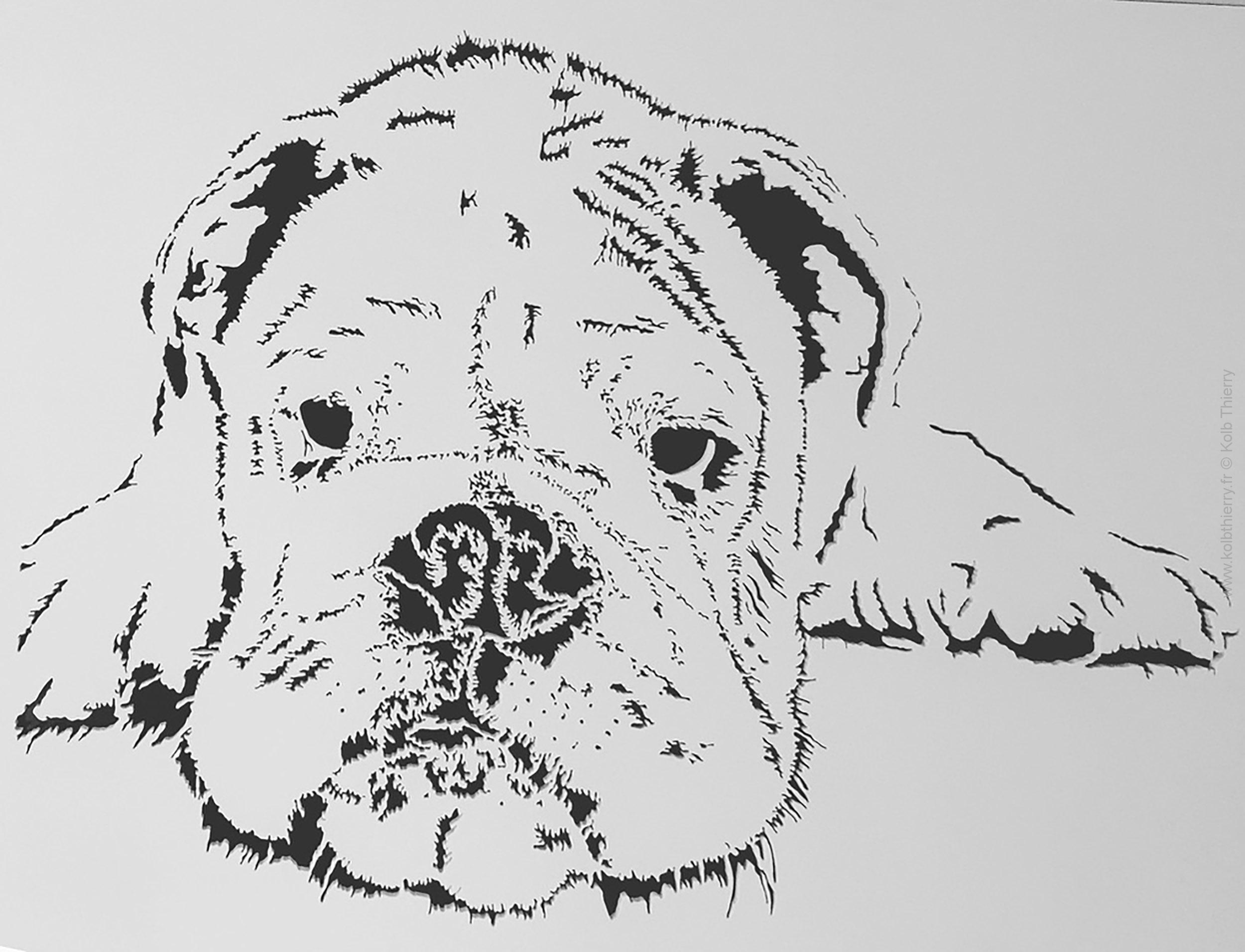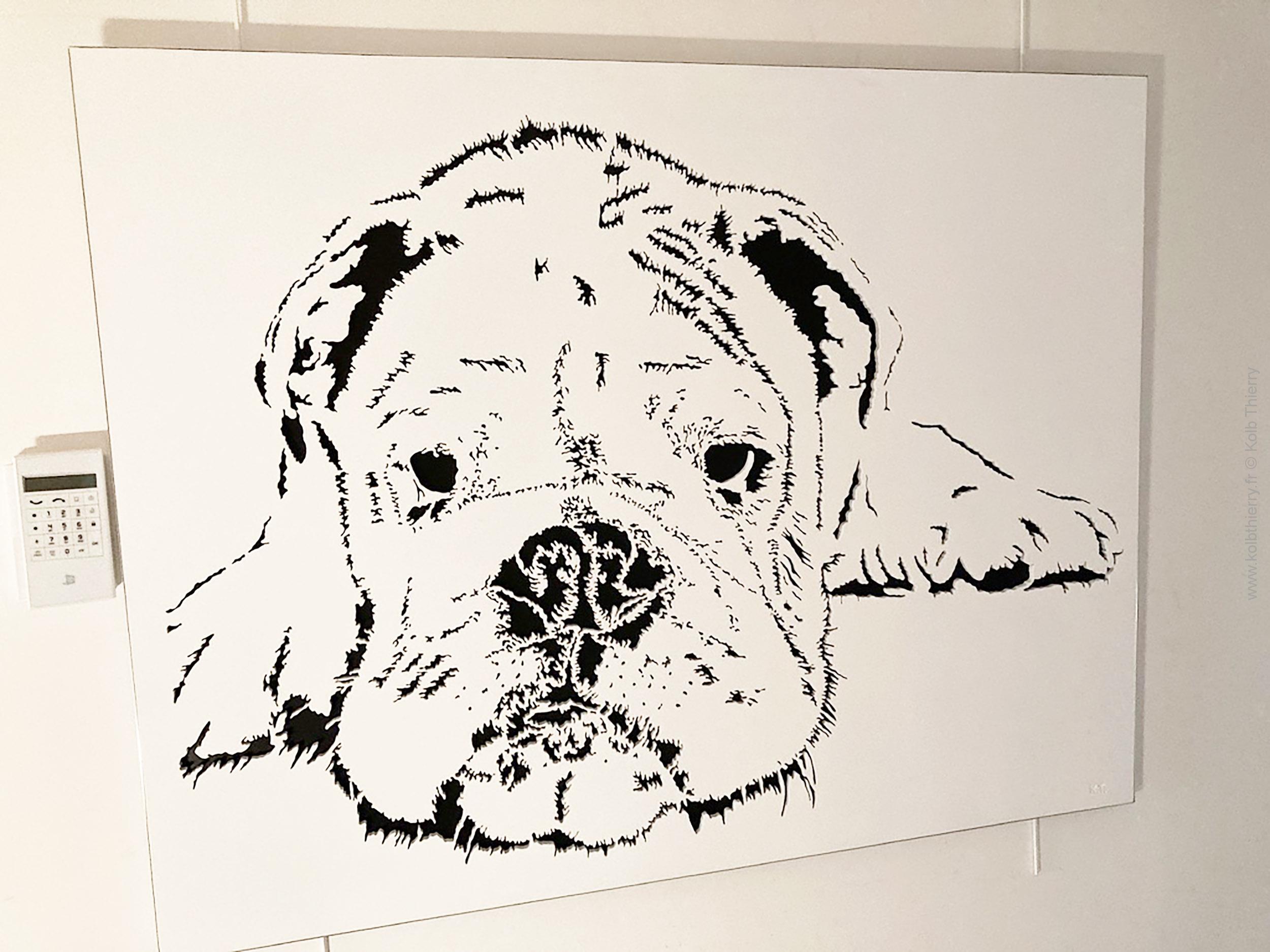 Roméo est une sculpture murale en bois découpé, d’une tête d’un adorable bulldog.